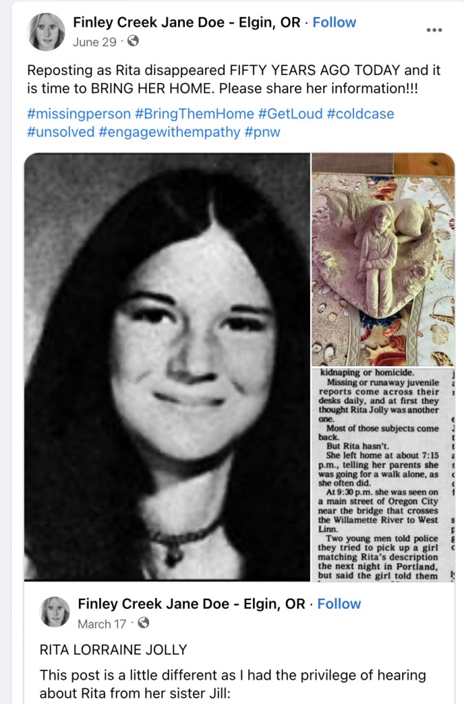 For more information and to ask questions about Rita’s case please visit Finley Creek Jane Doe page as Mel has worked directly with Jill on Rita’s case. Mel Jederberg runs all Finley Creek Jane Doe social medias and is happy to answer inquiries in Rita’s case.