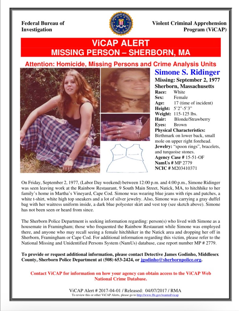 On Friday, September 2, 1977, (Labor Day weekend) Simone Ridinger was seen leaving work at the Rainbow Restaurant, on 9 South Main Street, in Natick, Massachusetts. Simone was a waitress and had finished her shift around 3 p.m. She had plans to hitchhike to her family’s home in Martha’s Vineyard, Cape Cod about 70 miles from the restaurant to spend the last few days of the summer with her family.