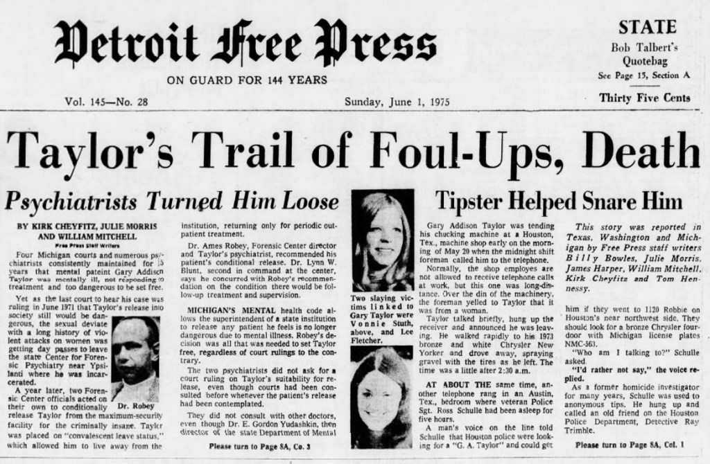 Taylor would be arrested in Texas in May of 1975 and through his lawyer they would discover that Taylor had murdered and buried 4 people at his previous home in Onsted, a small town just 30 miles from Ann Arbor.