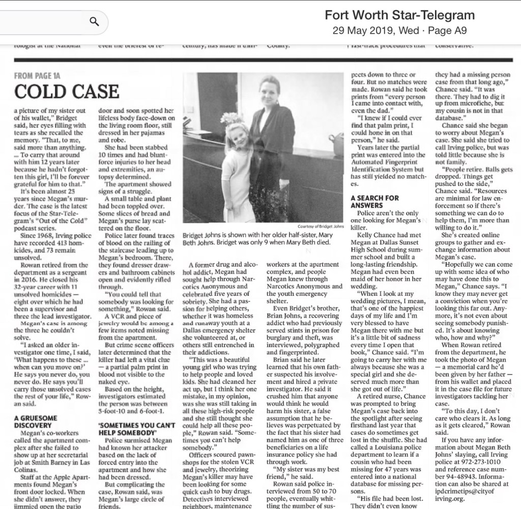 on the 29th anniversary of Megan’s death, the Irving police department released a video sharing case details in hopes it would generate new leads. I’ll be linking that in the comments and on the sipping on some crime website please go check it out and share.